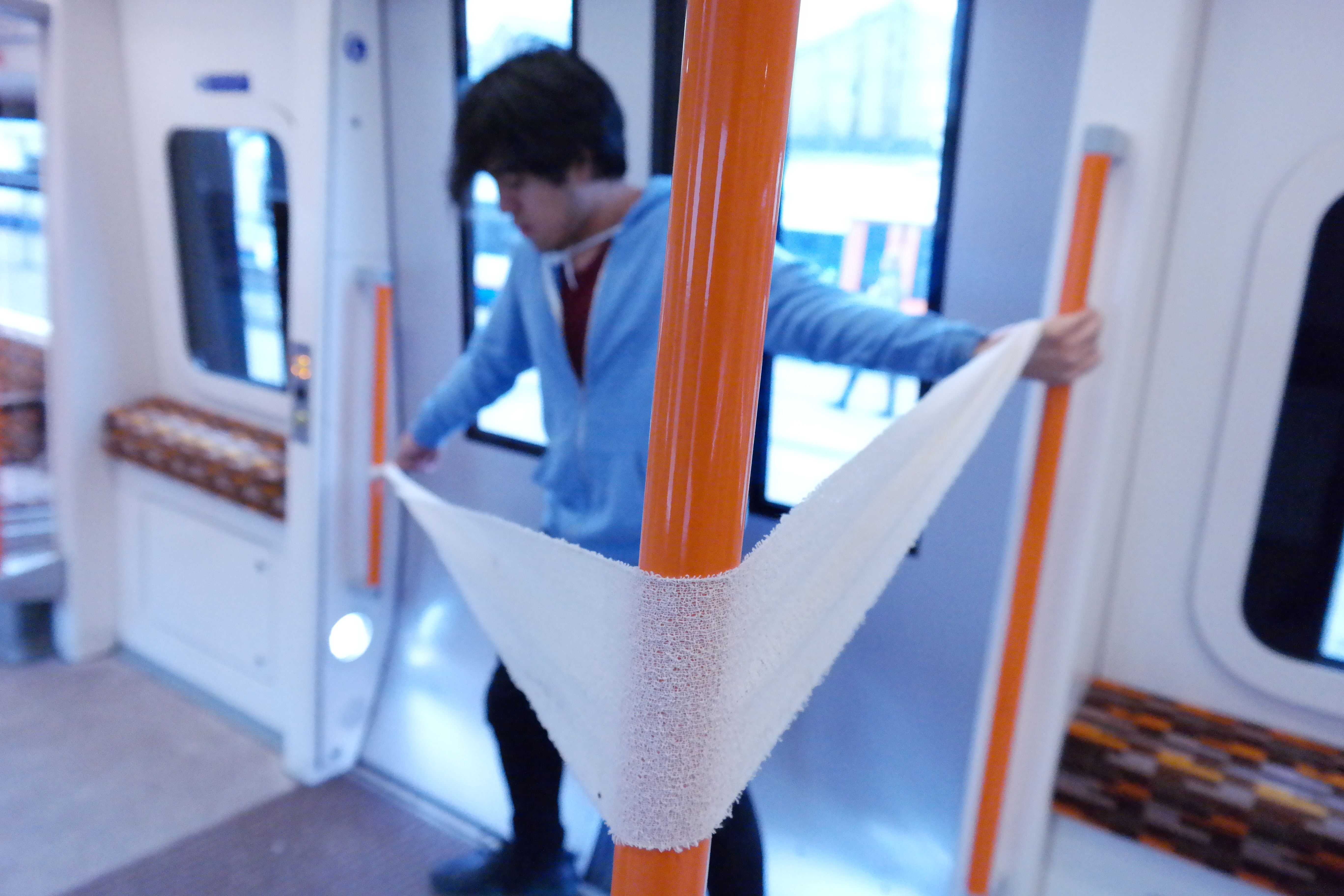 I wrapped myself using a bandage on the tube seats, as well as standing up whille the train was empty. I was looking for reflecting on the use of space, and the selfish aspect of it. The experiment was simple and of little depth, but it allowed me to imagine the possibilities of space usage.